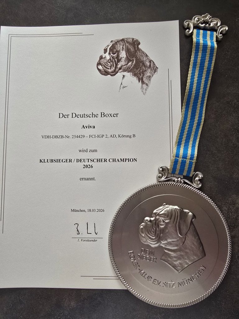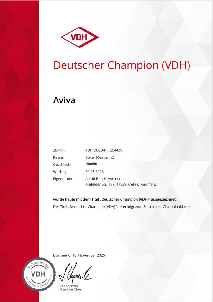 Ich züchte seit 1996 erfolgreiche und gesunde Boxer, die sowohl im Formwert als auch in der Leistung überzeugen können und bin Mitglied im Boxer-Klub E.V. – Sitz München.